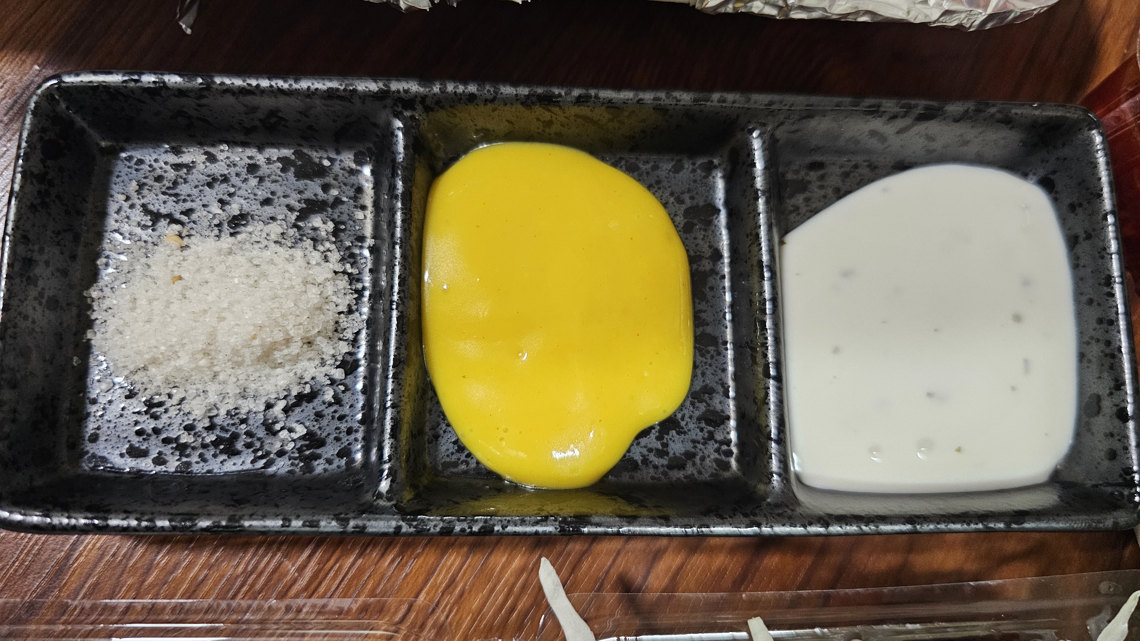 집에 있는 3구 그릇에 소금과 머스터드소스를 담다 보니,